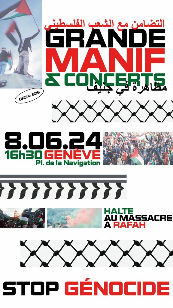 Avec le soutien : BDS Neuchâtel, BDS Lausanne, Apartheid Free Zone Genève, Les Foulards Violets, Collectif Urgence Palestine Genève, Collectif Urgence Palestine Vaud, Urgence Palestine Nyon-La Côte, Collectif Action Palestine Neuchâtel, Parrainages d’enfants de Palestine, Centre Culturel Autogéré l’Usine, Le Nadir, CEP-UNIGE, Solidarité Bosnie, Collectif Faites des Vagues, Foulards Violets, Collectif des Internationalistes tunisien.nes en Suisse, MARAD, Collectif juif décolonial, Le Tournoi Antiraciste Genève, SolidaritéS, Jeunesse solidaire, Action Antifasciste Genève, Union Populaire, Collectif Sud Global, Solidarité Tattes, Centrale Sanitaire Suisse Romande, Citoyennetés libres pour la paix en Colombie, librairie Fahrenheit 451, change4palestine, Outrage Collectif