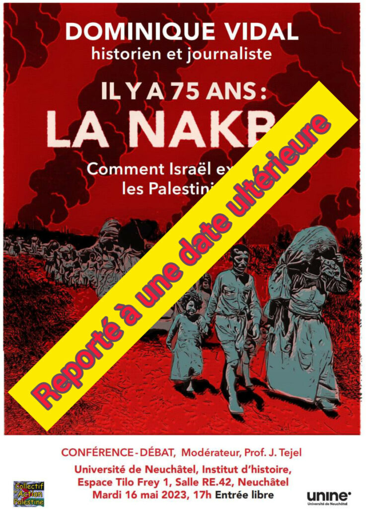 La conférence IL Y A 75 ANS:  LA NAKBA. Comment Israël expulsa les Palestiniens du Mardi 16 mai 2023, 17h a malheureusement dû être reportée à une date ultérieure pour des raisons de santé. Une nouvelle date sera communiquée dès que possible.