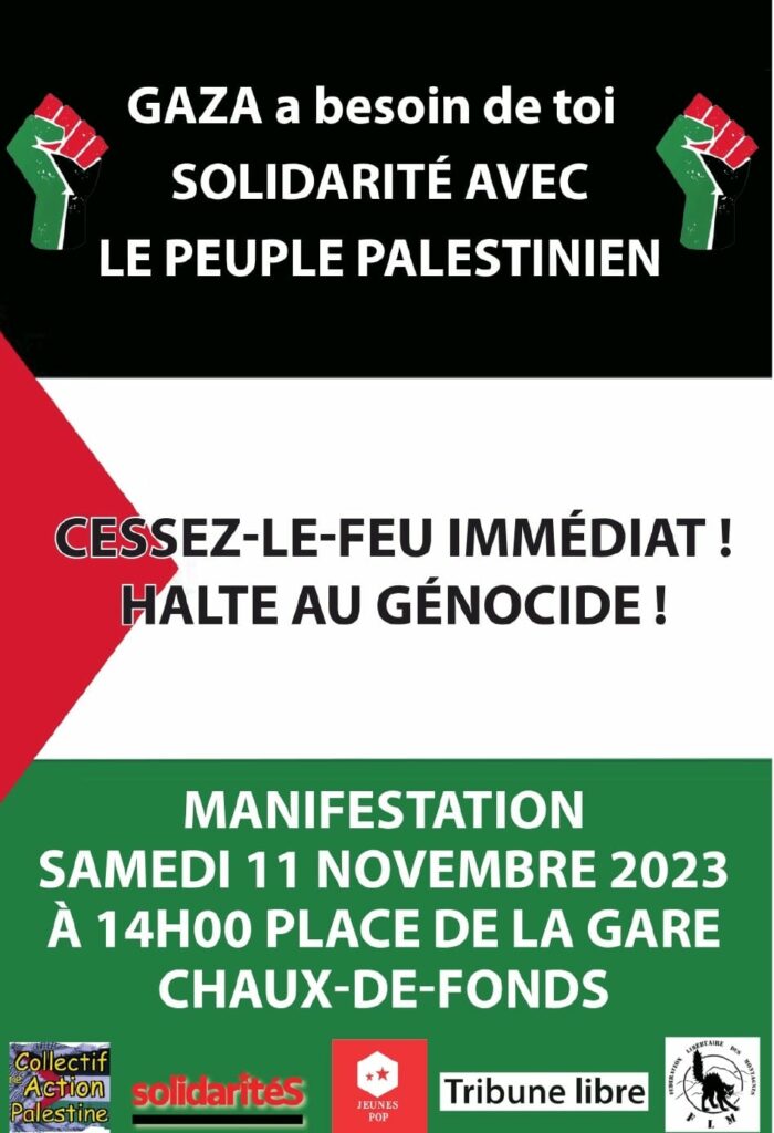 Manifestation pour un cessez-le-feu immédiat et un arrêt du génocide ce samedi 11.11 / 14h / place de la gare / la Chaux-de-Fonds ?? rejoignez-nous et transférez l’info aux personnes potentiellement intéressées!