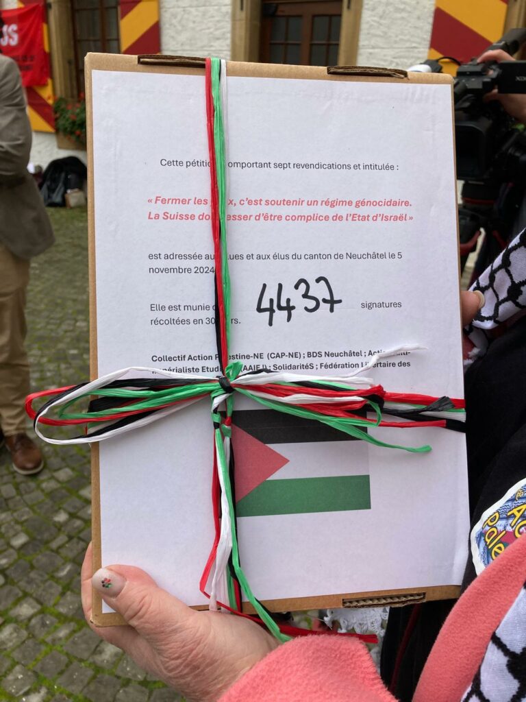 La pétition soutenue par le Collectif Action Palestine (CAP) – BDS Neuchâtel – Action Anti-Impérialiste Étudiante (AAIE!) – SolidaritéS – Fédération Libertaire des Montagnes – Jeunes POP – POP Littoral, ayant récolté plus de 4500 signatures, a été traitée lors de la séance du GC du 3 décembre 2025.