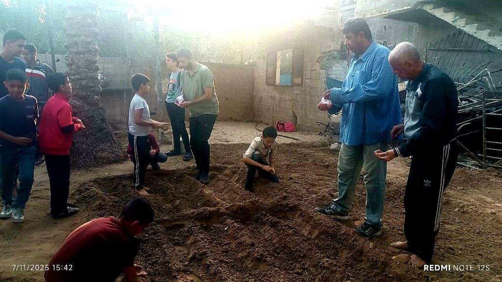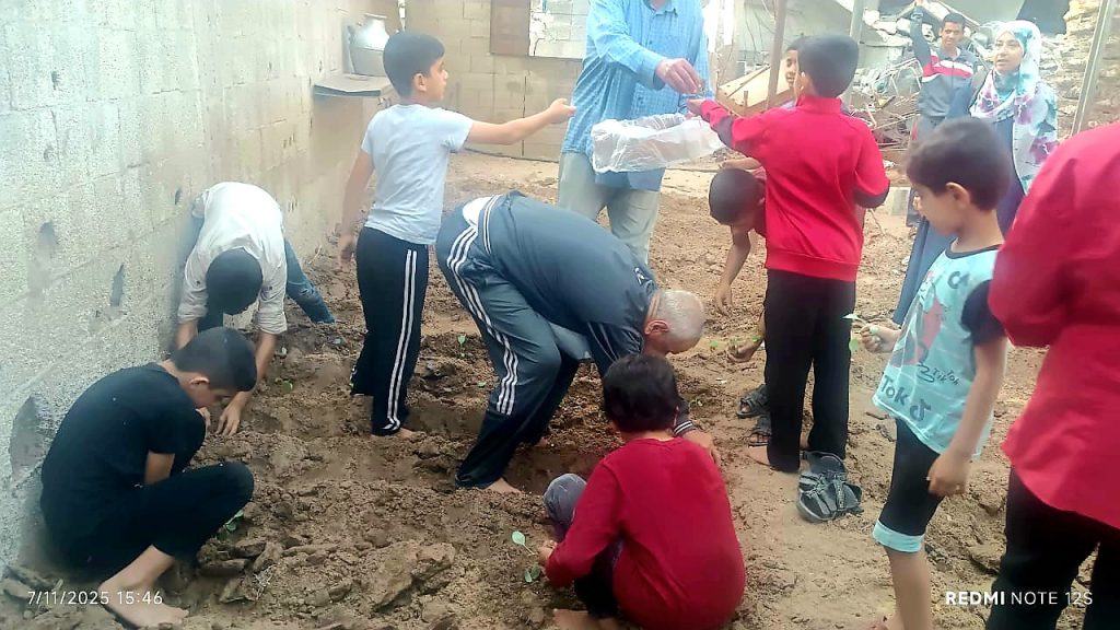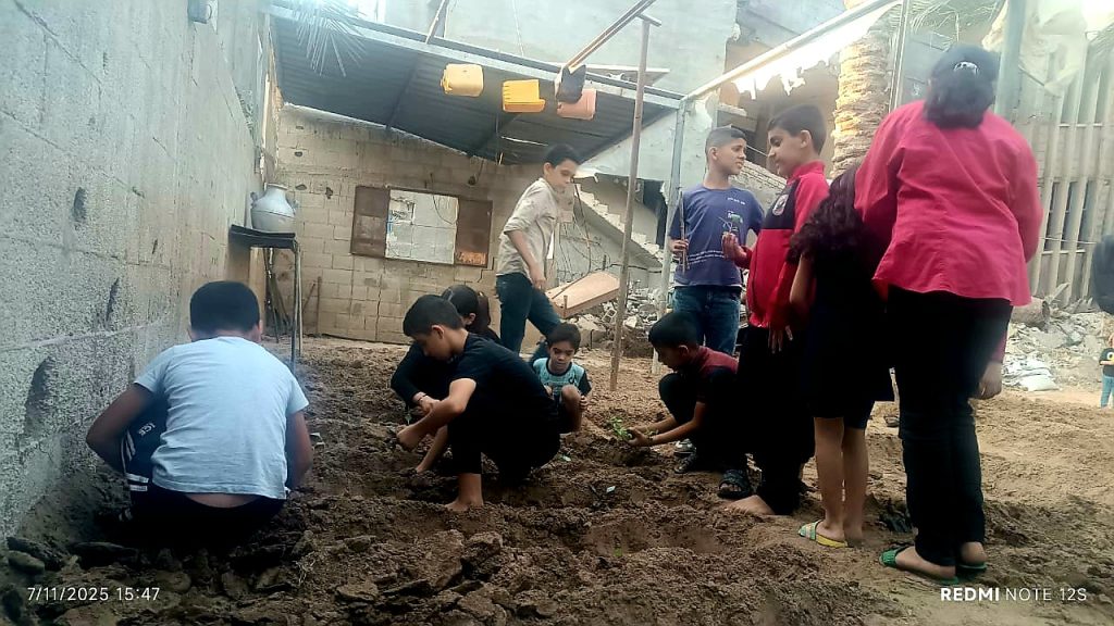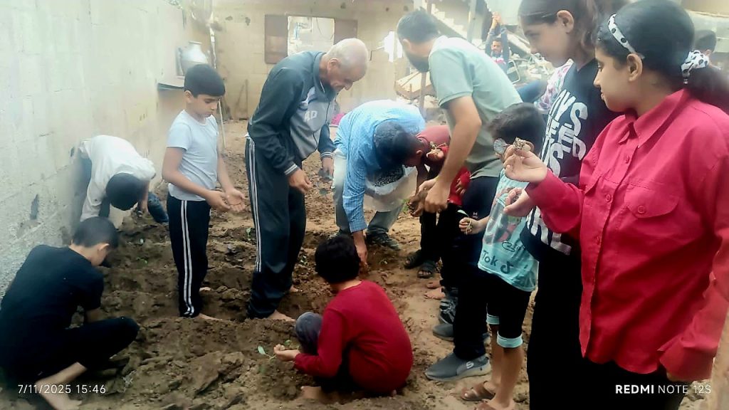 Malgré une situation explosive, un groupe de jeunes et d’enfants de Gaza a participé début décembre 2025, avec les familles, à planter des engrais et des semences dans un espace à côté des tentes.