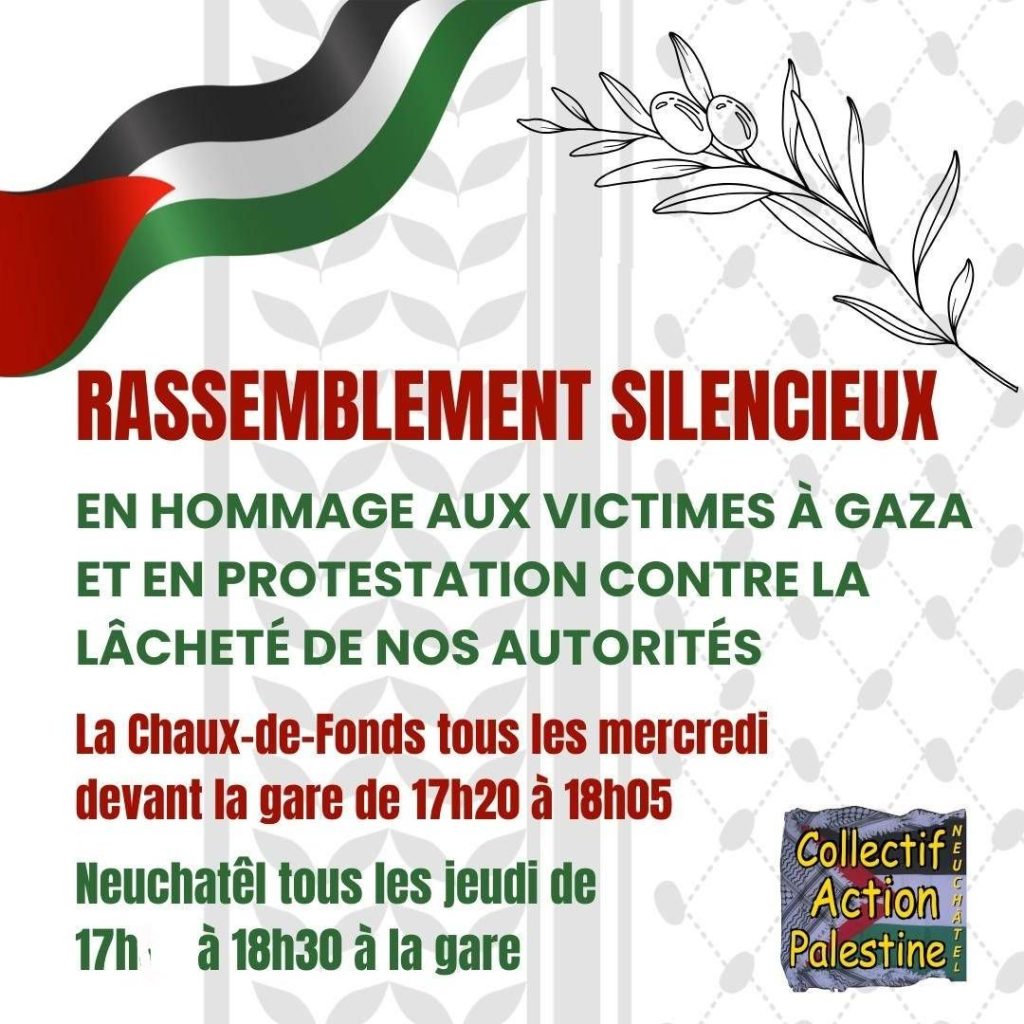 Un rassemblement silencieux se tiendra devant la gare de La Chaux-de-Fonds tous les mercredi de 17h20 à 18h05 en hommage aux victimes à Gaza et en protestation contre la lâcheté de nos autorités (mais pas toutes). Pour Neuchâtel, les rendez-vous sont fixés le jeudi, de 17h00 à 18h30, à la gare de Neuchâtel.